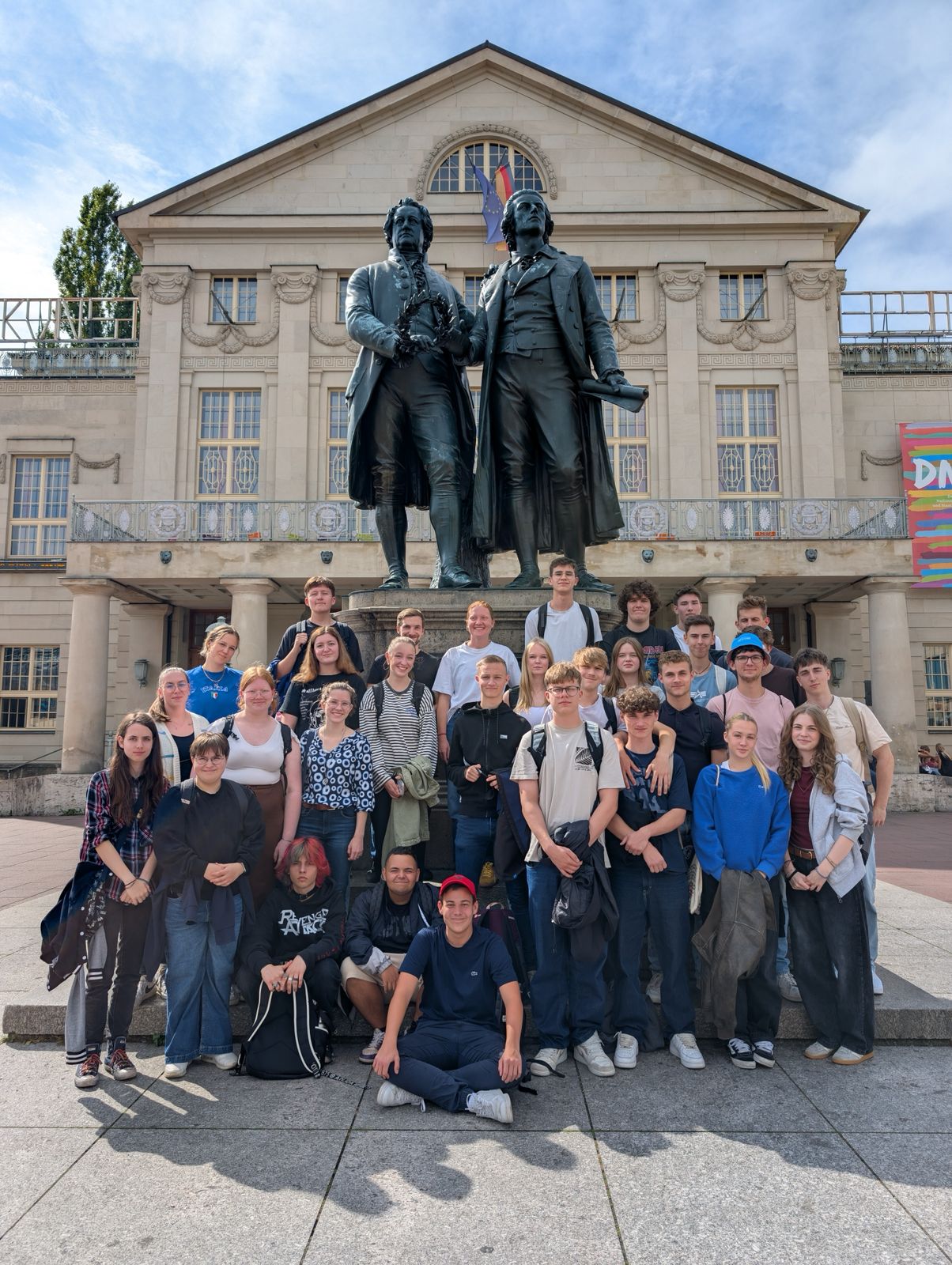 In all diesen Epochen entstanden und entstehen neue Ideen und Ideale, die ihre Zeit maßgeblich prägen. Ähnlich verhält es sich in Goethes Drama „Faust“, in dem Unter- und Oberwelt, Wissenschaft und Magie, und geistige und menschliche Gelüste aufeinandertreffen. All dies erlebte die Kursstufe 12 am 9. September 2025 hautnah, indem sie das Wohnhaus von Schiller, die aktuelle interaktive Ausstellung zu Goethes „Faust“ und auch das Museum „Haus der Weimarer Republik“, das sich direkt gegenüber dem Nationaltheater und dem Goethe-und-Schiller-Denkmal befindet, besuchten. Die Exkursion ermöglichte uns Schülern einen neuen Blickwinkel auf die verschiedenen Epochen, aber auch auf die Lehren und Ideen, die wir aus ihnen ziehen können. Johannes Pfister, 12/2